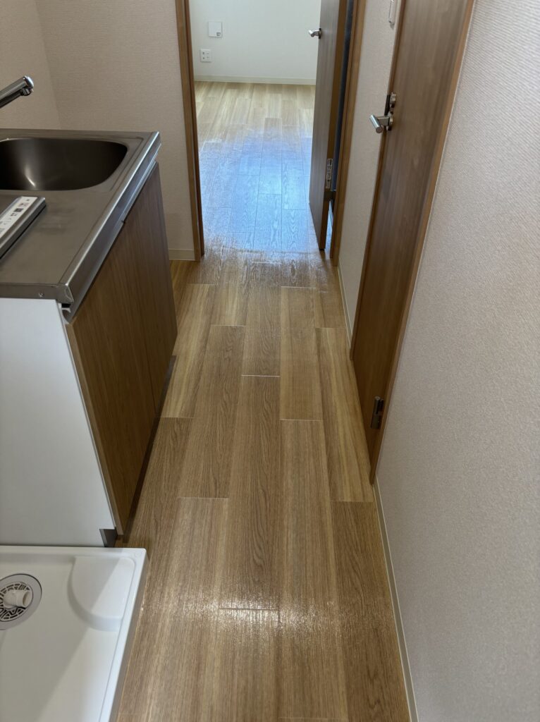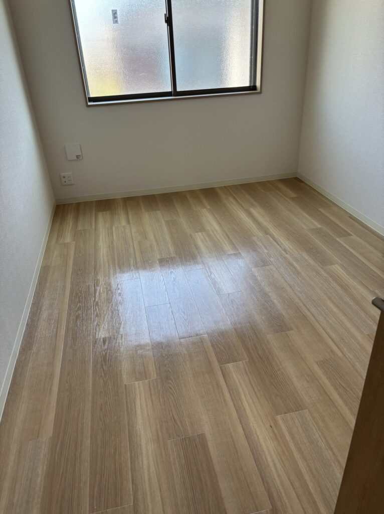 最後はお部屋全体の床清掃。フローリングは専用機材でホコリや皮脂汚れを取り除き、ワックスを2層塗りで仕上げました。ツヤと保護効果が加わり、お部屋が明るく広く見える印象に。