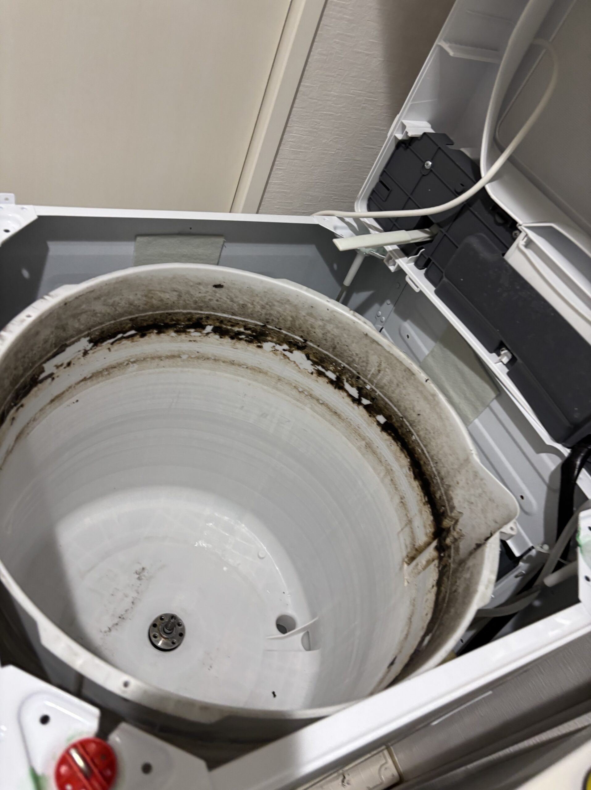 今回の機種は縦型洗濯機で、外観は一見きれいな状態でしたが、洗濯槽を分解してみると、内部には長年の使用による黒カビや洗剤カス、皮脂汚れがびっしりと付着していました。市販の洗濯槽クリーナーでは落としきれない汚れが多く、分解洗浄の必要性を改めて実感する状態でした。