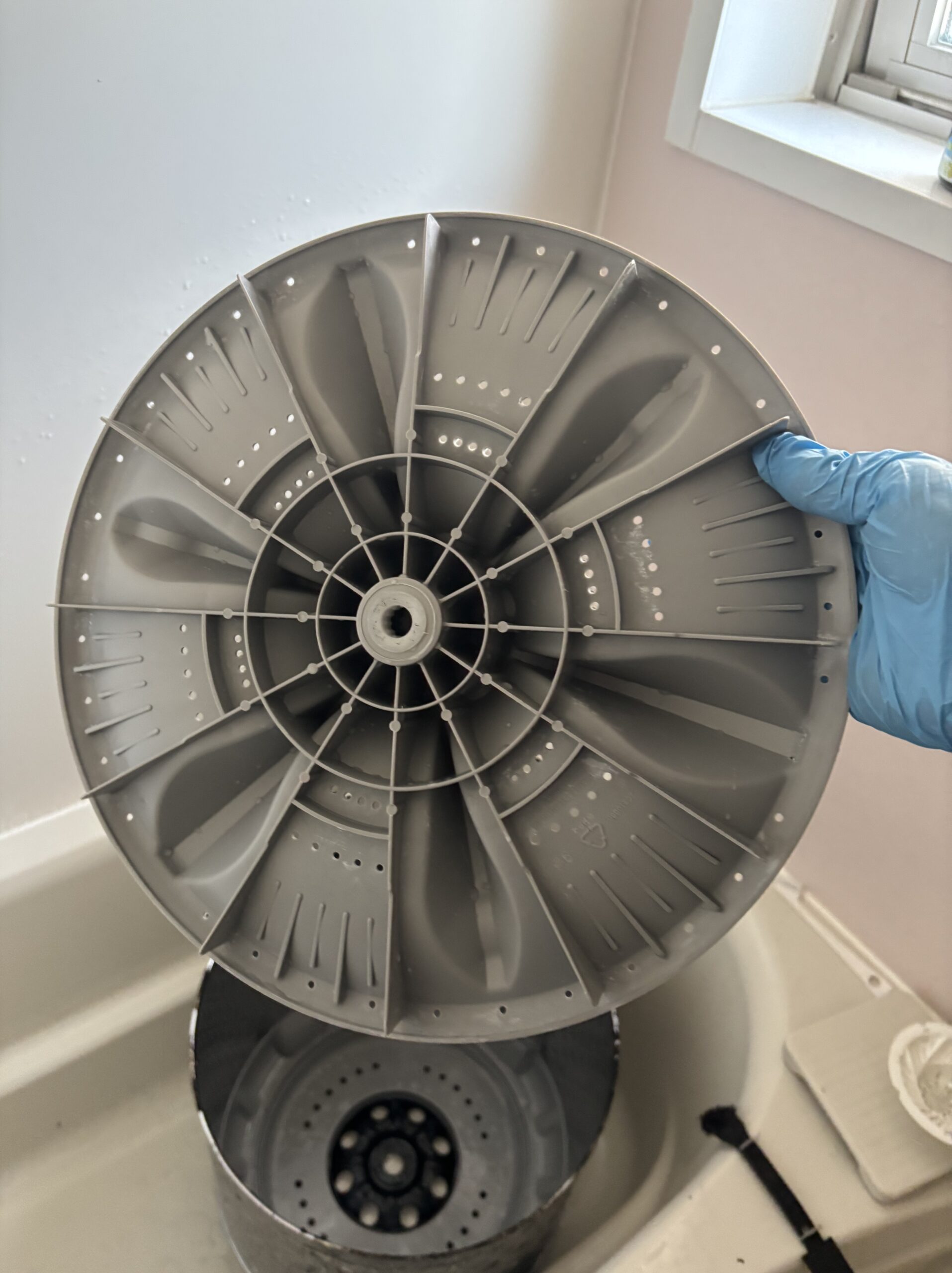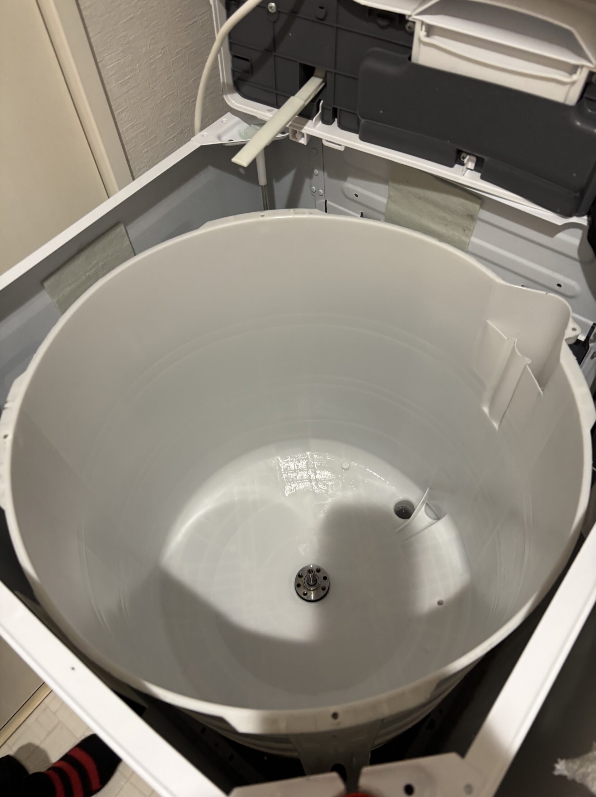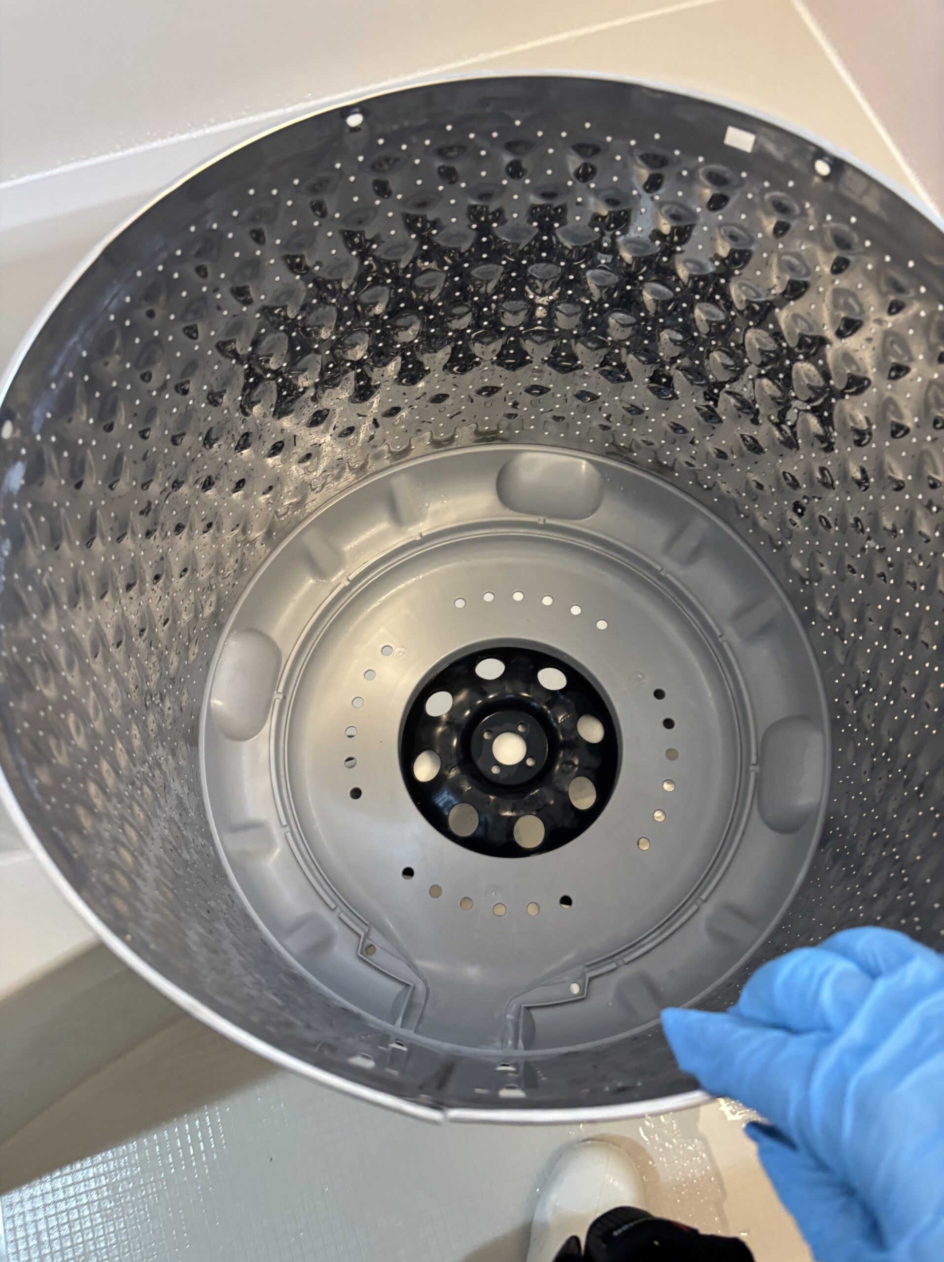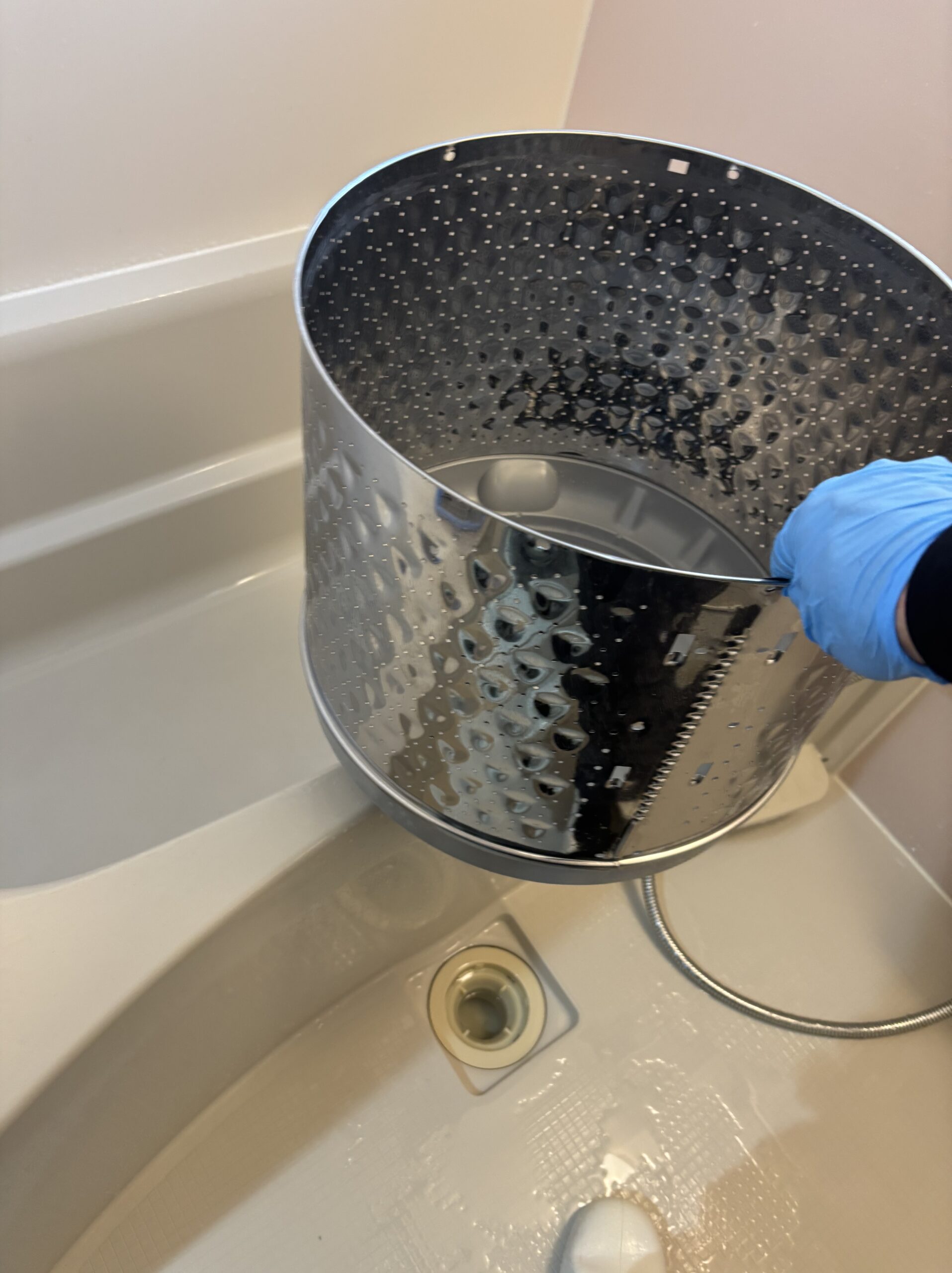 取り外した洗濯槽やパルセーター、外槽内部を専用の洗剤と高圧洗浄を使って丁寧に洗浄。細かい部分や裏側までしっかりと汚れを落とし、見違えるほどきれいな状態に仕上げました。洗浄後は各部品を元通りに組み立て、動作確認も問題なく完了しています。