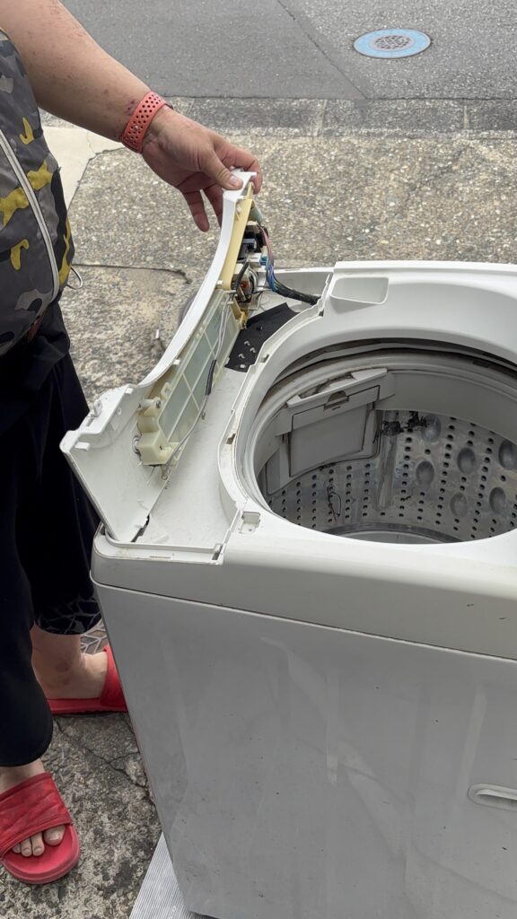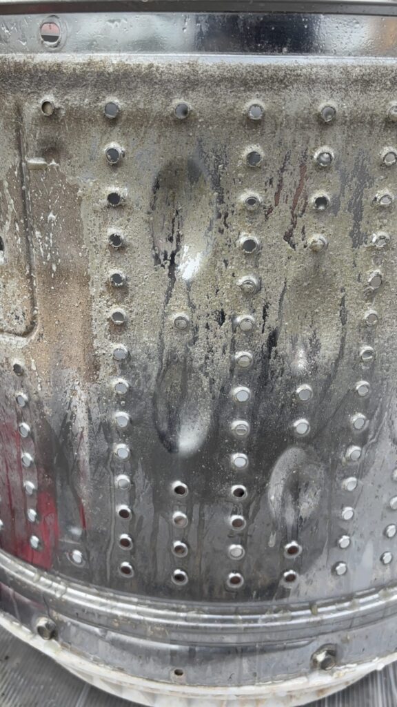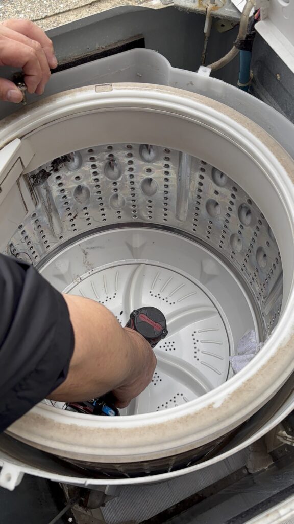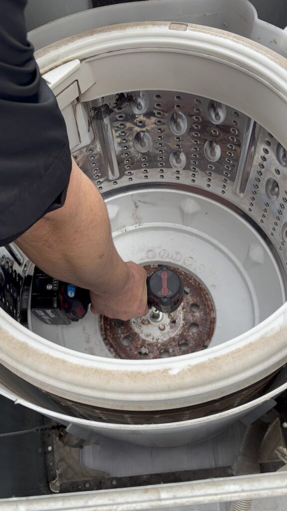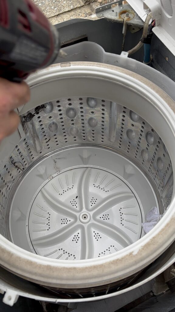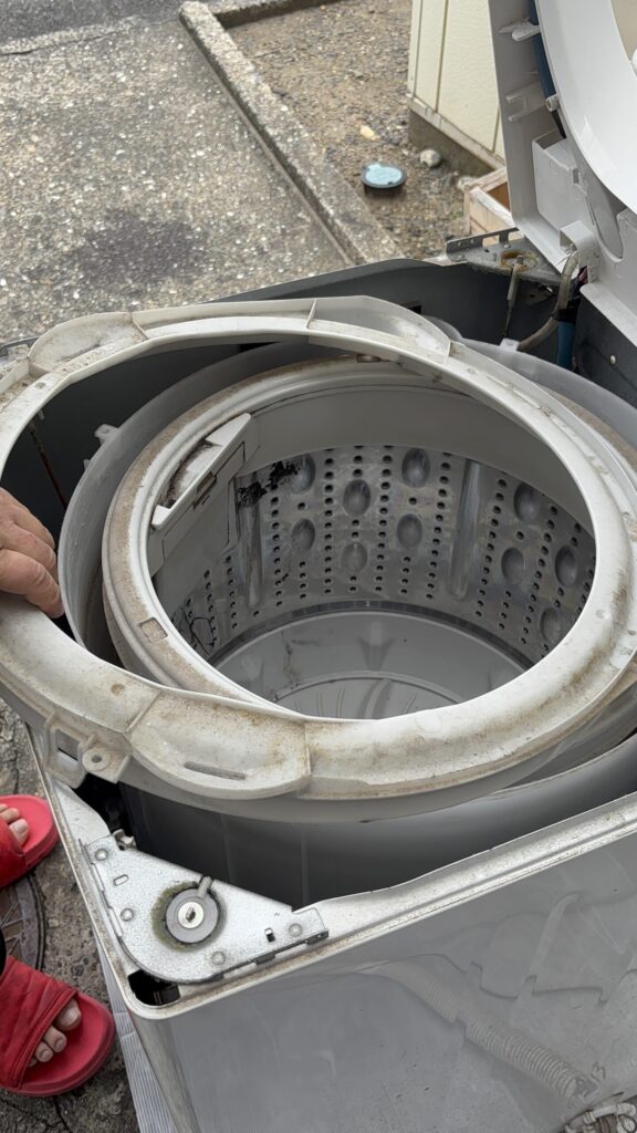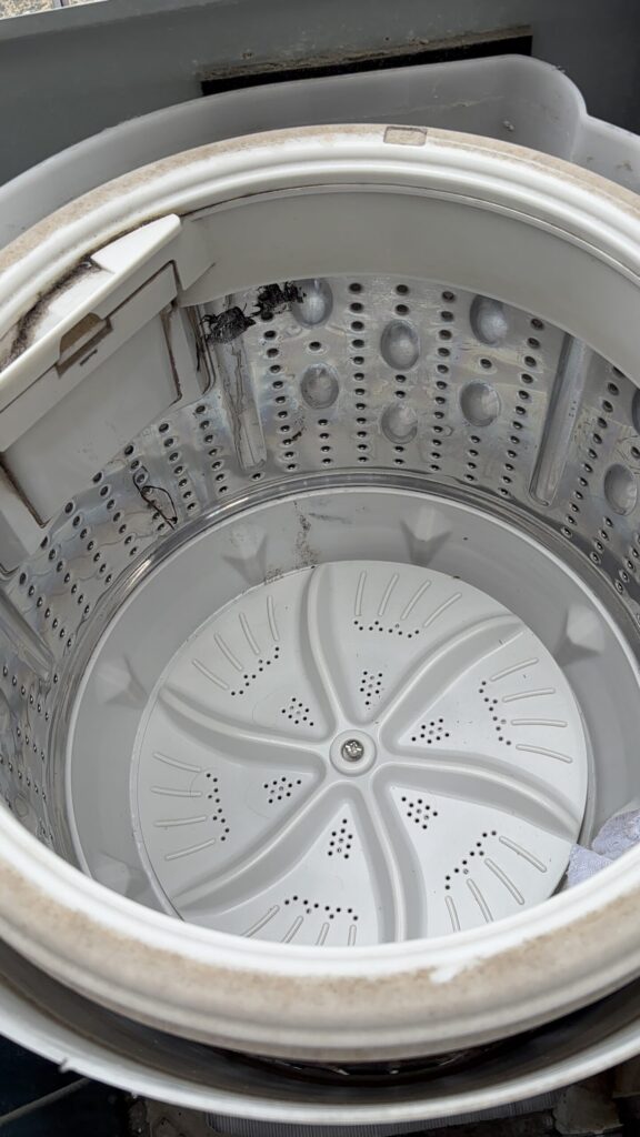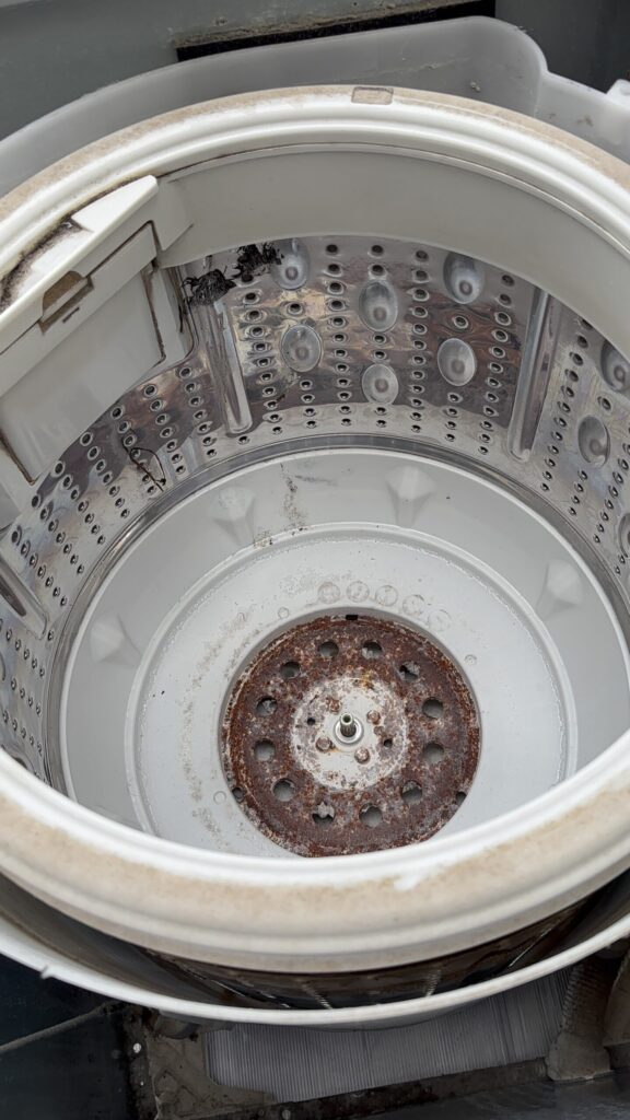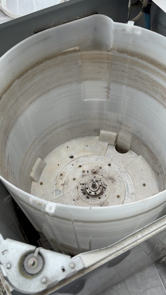 長年使用されている洗濯機は、洗濯槽の裏側にカビや洗剤カスが溜まりやすく、通常の洗濯だけでは落としきれない汚れが発生します。今回はその汚れを徹底的にクリーニングするため、分解洗浄を実施しました。