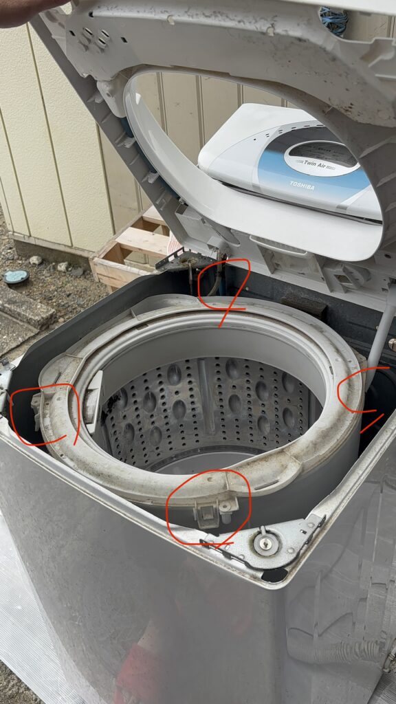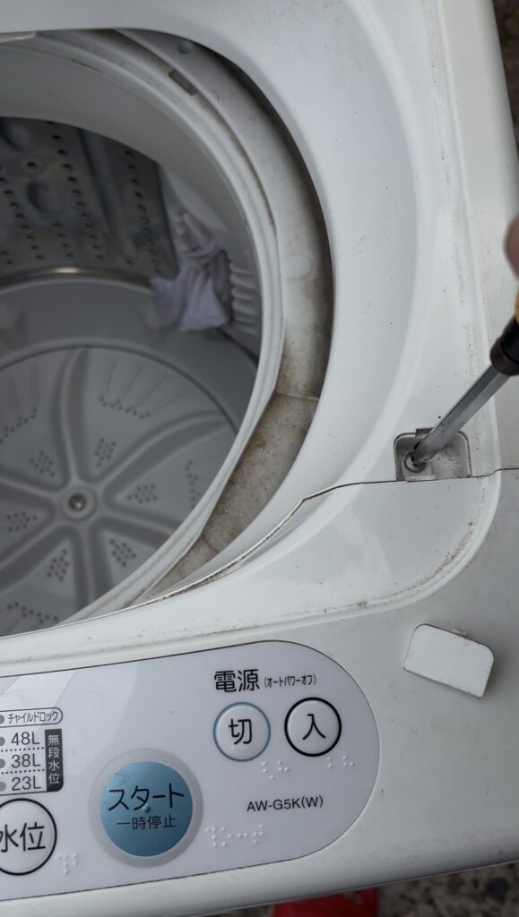 洗濯槽の上蓋を固定しているパッチを外し、上蓋を取り外します。