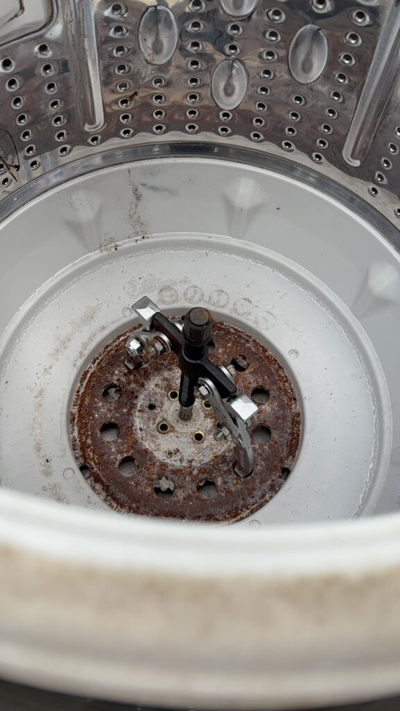 ギアプーラーを使用して槽を引き抜き、間に挟まっている部材も丁寧に取り外します。