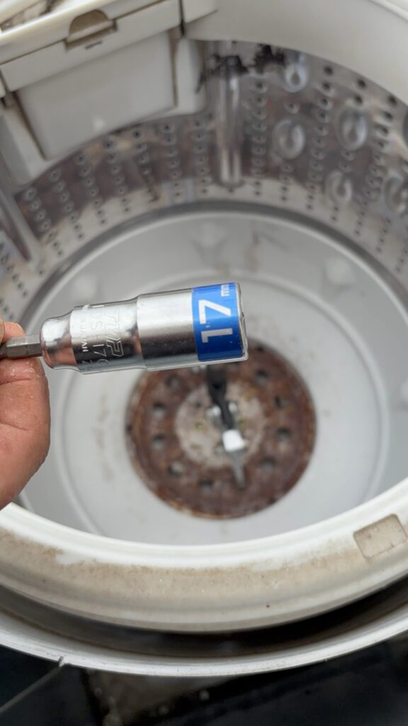 洗濯槽を止めているボルトを外して、槽を取り外す準備を進めます。