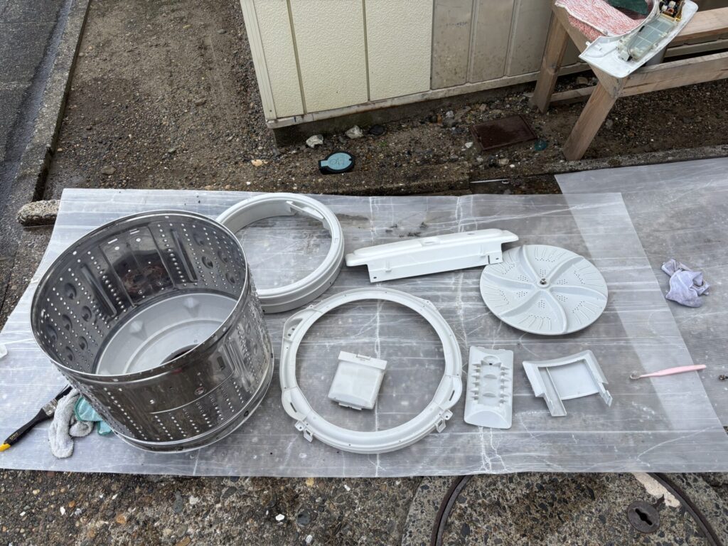 洗濯槽をさらに分解し、裏側のパーツまで細かく分けていきます。