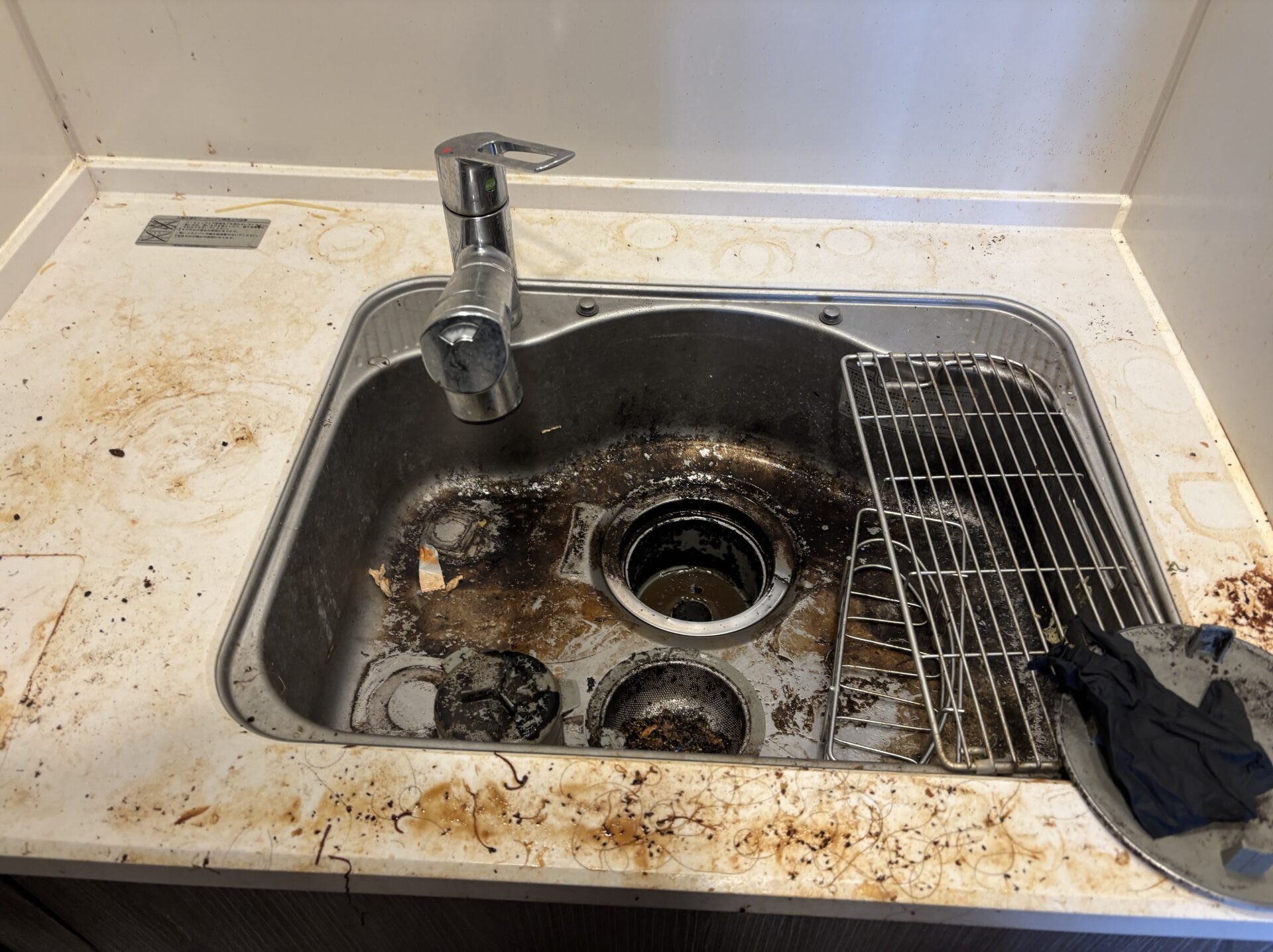 ご依頼いただいたキッチンは、長年の使用によるガスコンロ周りの油汚れ、壁面のベタつき、シンクの水垢やくすみが目立つ状態でした。特にコンロ周辺は油が固着し、ご家庭でのお掃除では落としきれない汚れが蓄積していました。