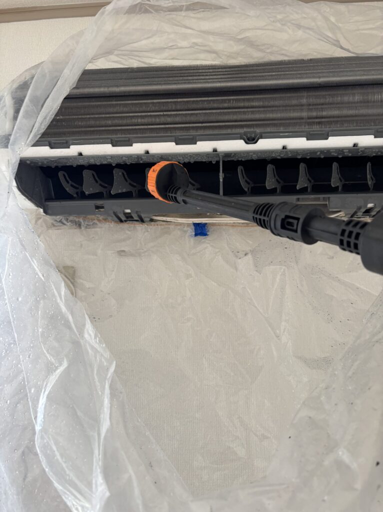 フィルター・カバーを取り外し、高圧洗浄機でアルミフィンや送風ファンの奥まで丁寧に洗浄します。